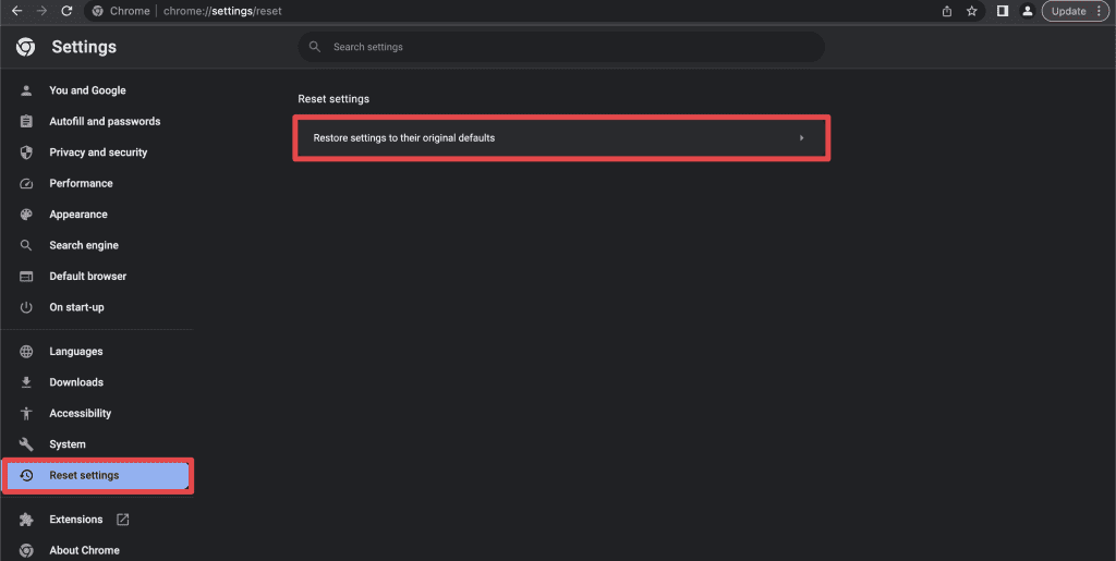 - 在下一個窗口中,單擊重置設置在左側欄中,選擇還原設置為其原始默認值。