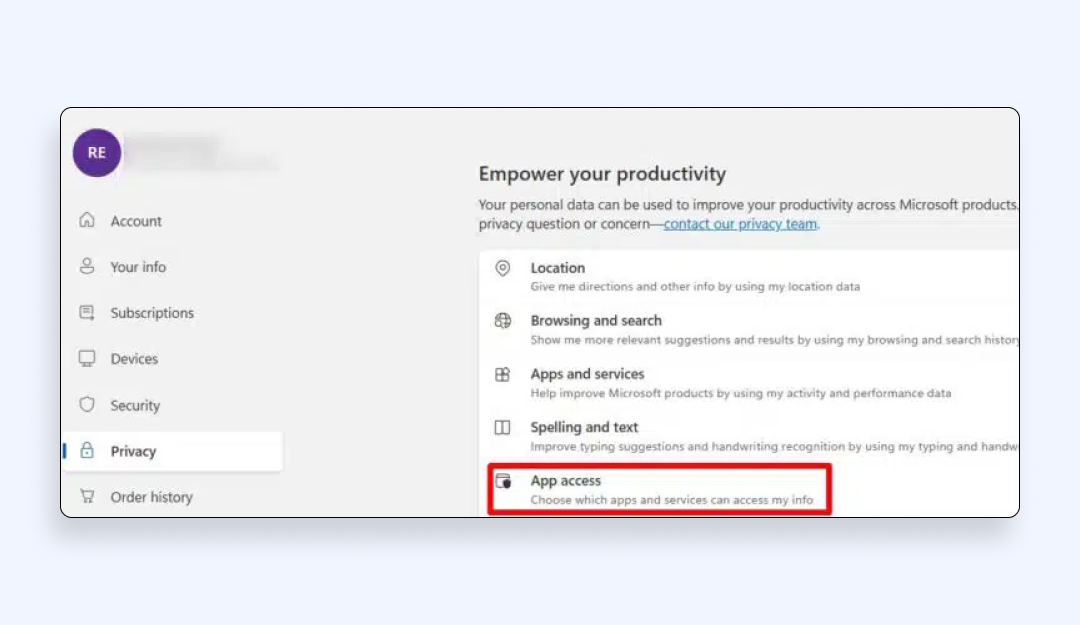 - 單擊任何條目旁邊的“ⓘ”圖標,讀取共享數據點(姓名、電子郵件、個人資料圖片等),然後在完成後單擊“刪除訪問權限”。