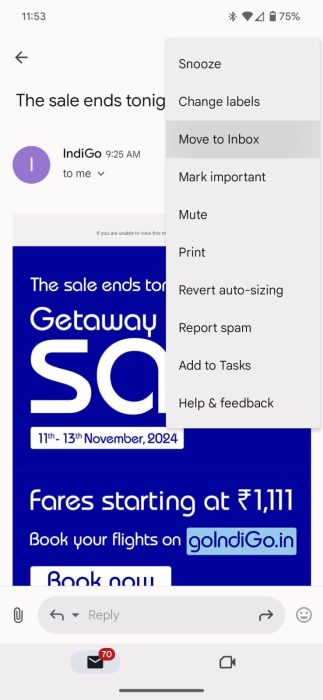 - 選擇移至收件箱將電子郵件帶回您的主收件箱。