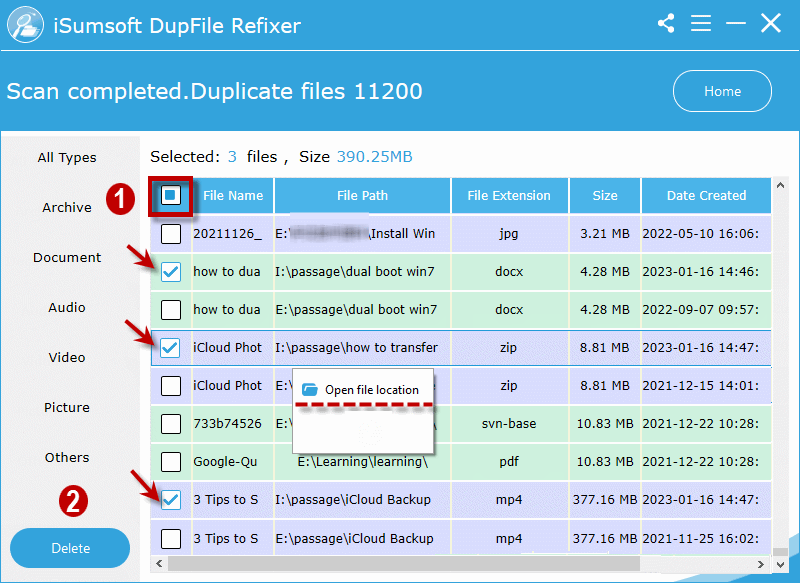 步驟 3:很快,iSoft DupFile Refixer 將自動查找所選文件夾中的所有重複文件並對其進行分類。只需點擊旁邊的框即可文件名選擇所有重複文件並立即刪除它們。
