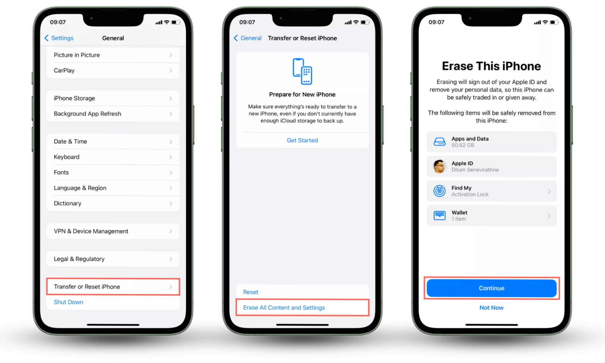 步驟 1-3:前往“設置”>“通用”>“傳輸和重置 iPhone”>“刪除所有內容和設置”以刪除您的 iPhone。