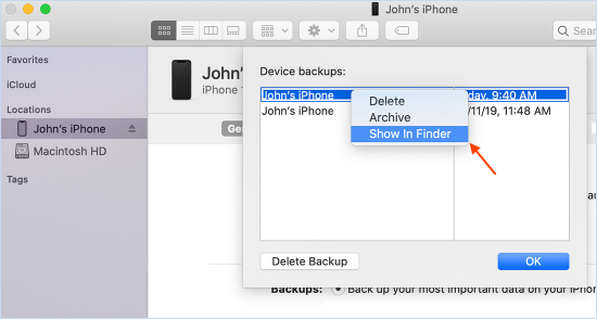 步驟 3:單擊所需的備份,然後選擇在 Finder 中顯示。