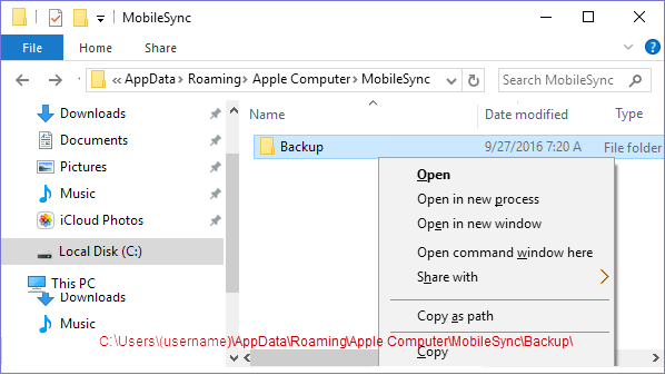 然後導航至C:Users(用戶名)AppDataRoamingApple ComputerMobileSyncBackup
