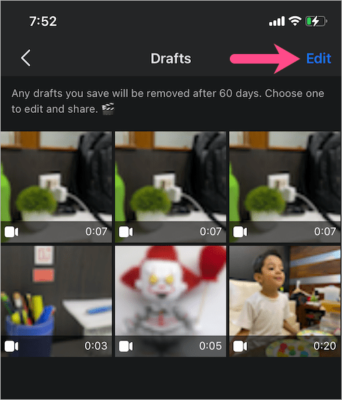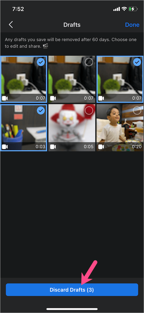 - “草稿”屏幕將顯示您保存為草稿的所有 Facebook 捲軸。