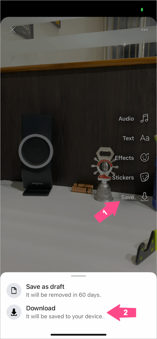 筆記:您無法在未發布的情況下將草稿捲軸與音樂一起保存到圖庫中。這是因為任何使用 Instagram 或 Facebook 音樂庫中的外部音頻的捲軸在保存時都不會包含音樂。同時,帶有麥克風錄製的攝像機音頻的捲軸將保留原始聲音。