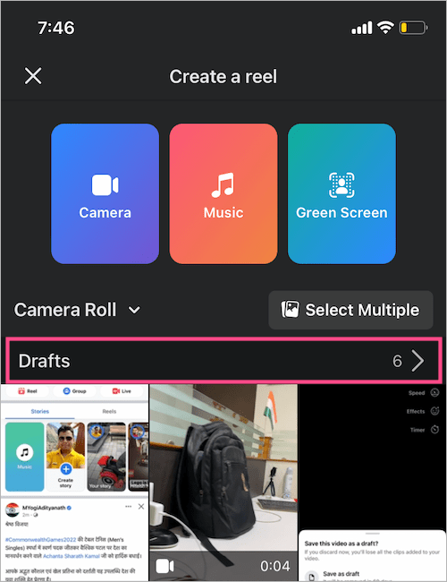 當您位於捲軸編輯器屏幕上時,點擊左下角的“添加媒體”圖標。接下來,轉到“草稿”目錄,在一處查看所有 Facebook 捲軸草稿。
