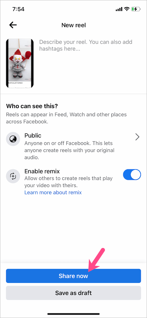 要發布草稿卷,請轉到“草稿”文件夾並點擊您要發布的某個卷。根據需要進行任何最終更改,例如添加新剪輯、反轉捲軸視頻以及將效果、貼紙、音樂或文本應用到捲軸。完成後,點擊“立即分享”按鈕在 Facebook 上發布您的視頻。