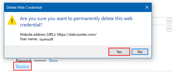 如果您不想將該憑據保存在您的電腦上,或者您保存了錯誤的密碼,這可能會導致無法使用 Microsoft Edge 登錄該網站。您可以點擊消除按鈕刪除憑證。當提示您確認決定時,單擊是的確認並刪除已保存的憑據。