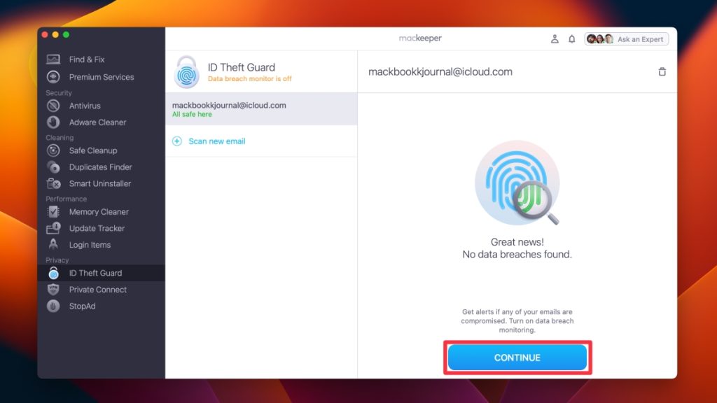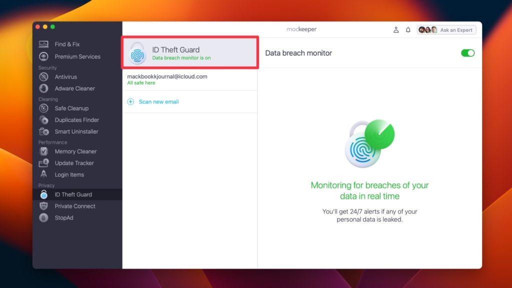 - 你會看到數據洩露監控已開啟窗口頂部的通知。它將在後台監控您的 Mac,並在發生數據洩露或洩漏時立即通知您,以重新保護一切并快速防止進一步的損壞。