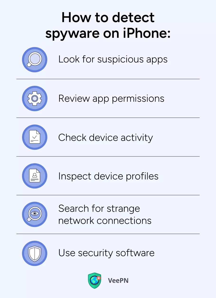 間諜軟件是一個棘手的網絡威脅,似乎從未有過。我們認為,我們的建議可以幫助您在iPhone上檢測間諜軟件,以及最好的選擇,以防止其進入設備。 Veepn是一個多合一的安全應用程序,可以幫助您確保iPhone始終安全。它提供了一個內置的adblocking工具,該工具會自動防止瀏覽器中的任何惡意彈出廣告並漏洞警報,該廣告會立即通知您有關您的個人信息的洩漏。
