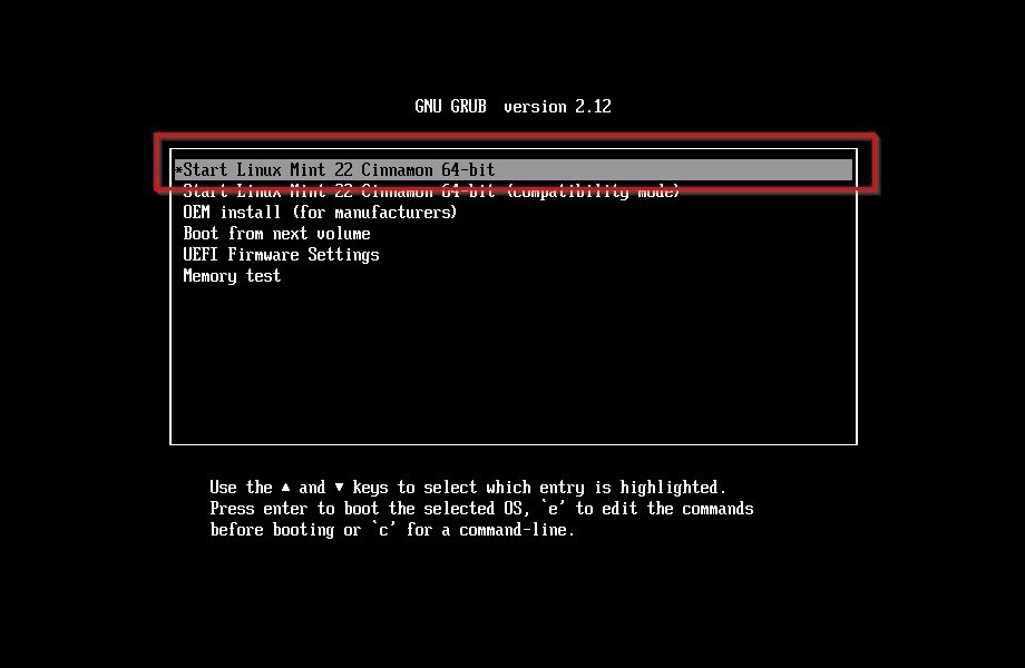 - 訪問 PC 的 BIOS/UEFI 屏幕並將可啟動媒體設置為主啟動設備(有關詳細信息,請參閱主板手冊)。啟動 Linux Mint,然後選擇其“main”第一個條目。如果失敗,請使用第二個條目重試(以“兼容模式”結尾)。