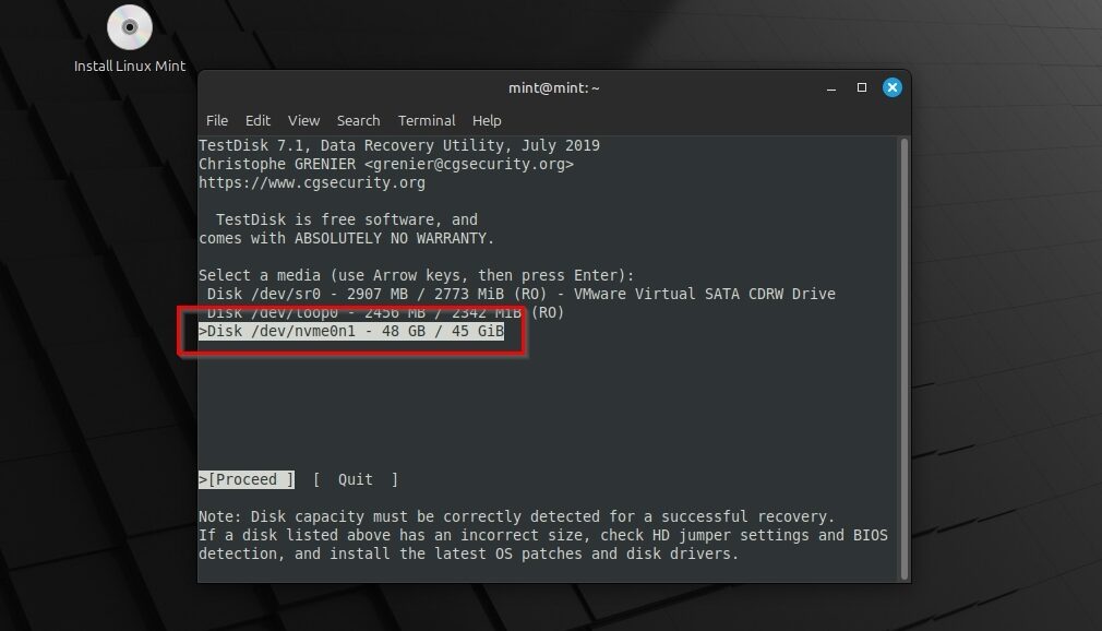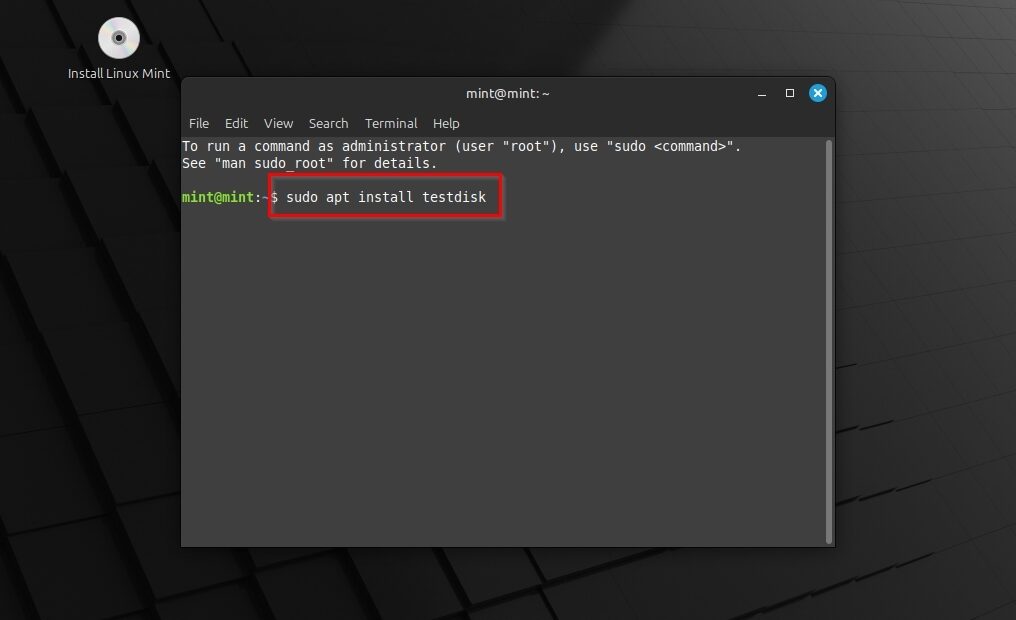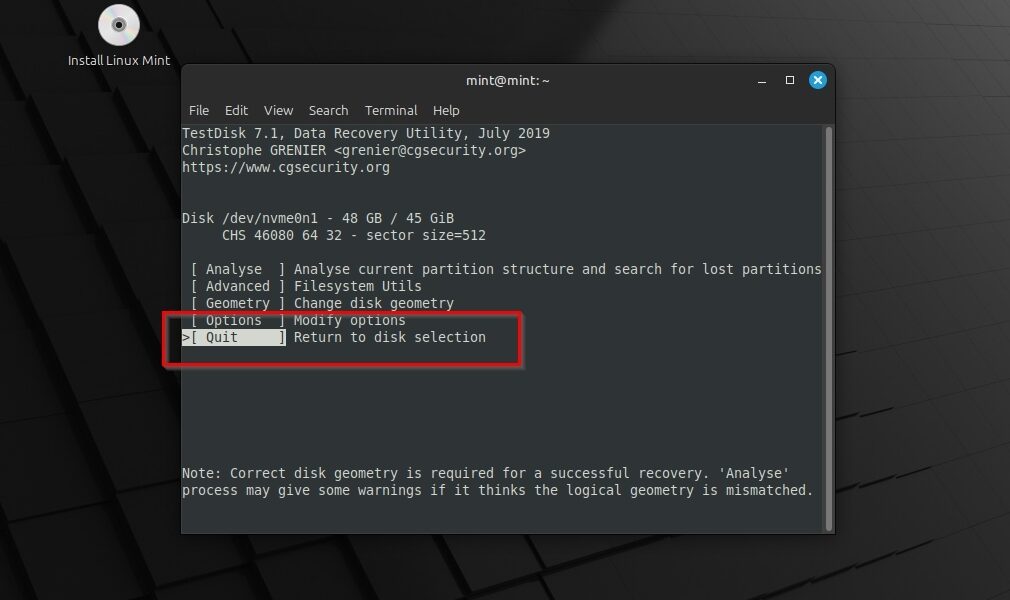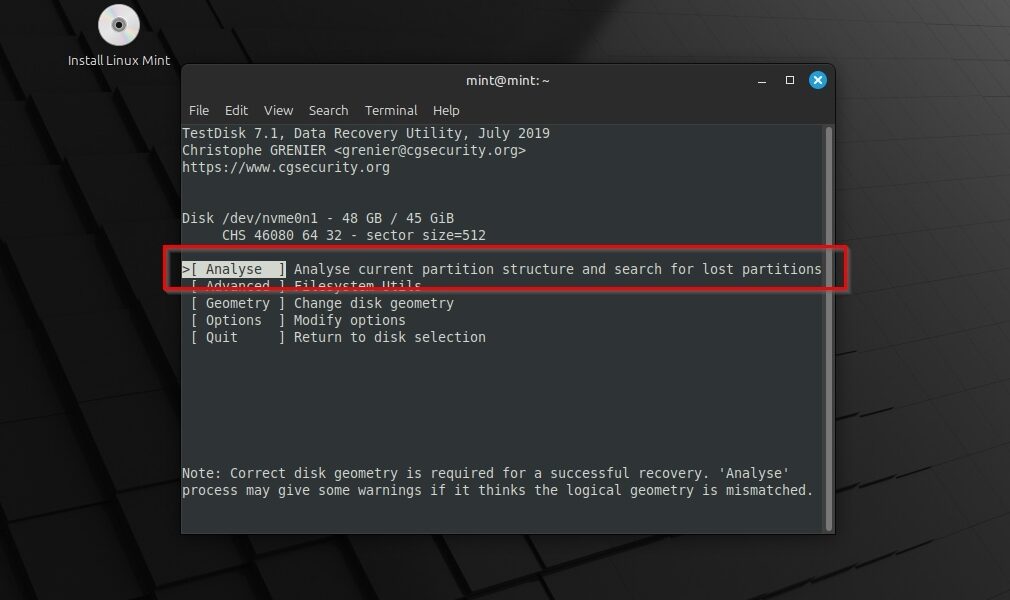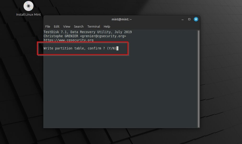 要通過在可啟動版本的 Linux Mint 上運行 TestDisk 來查找和恢復丟失的分區: