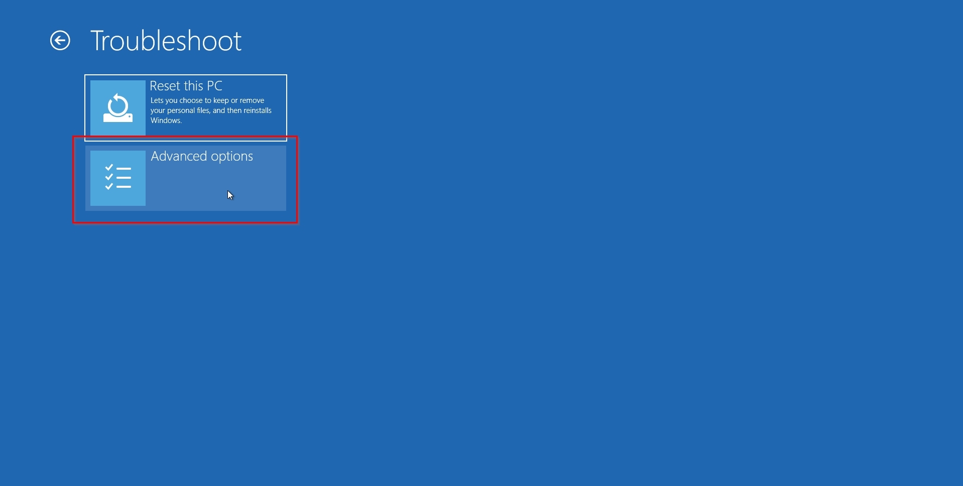- 啟動至 Windows 恢復環境。選擇故障排除>高級選項>命令提示符。