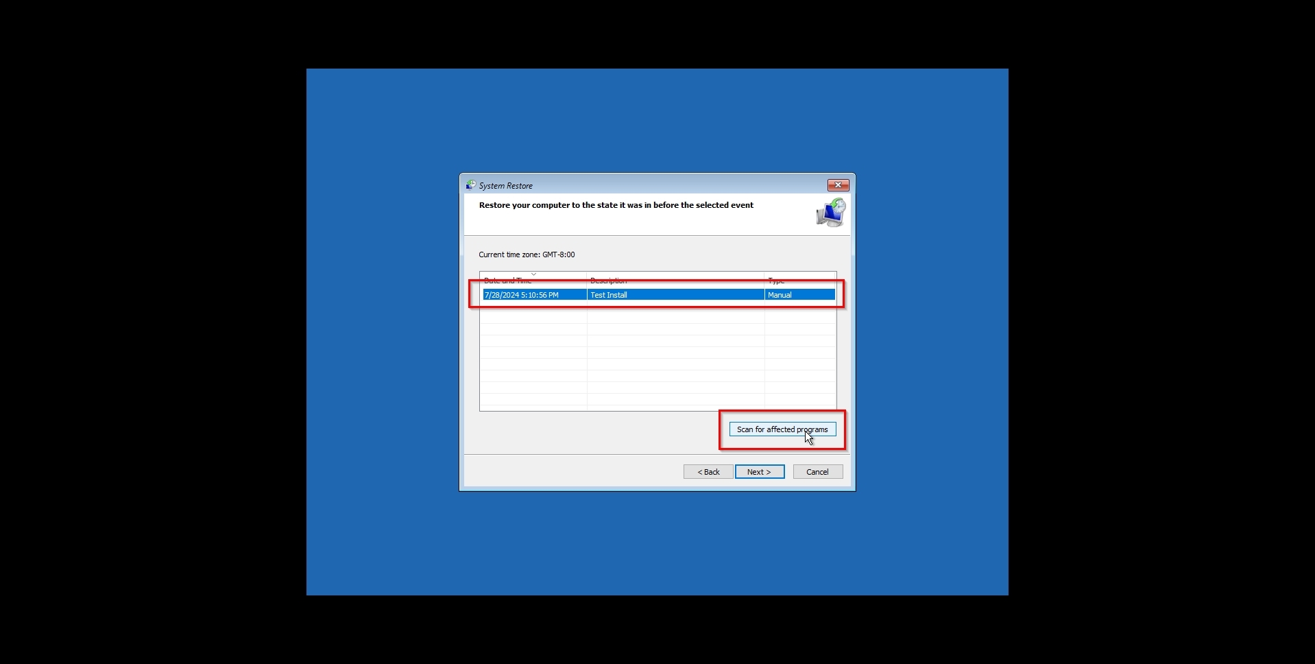 - 選擇系統還原的檢查點之一(如果有多個可用)。你可以掃描受影響的程序查看恢復到該檢查點後可能會停止工作的內容。