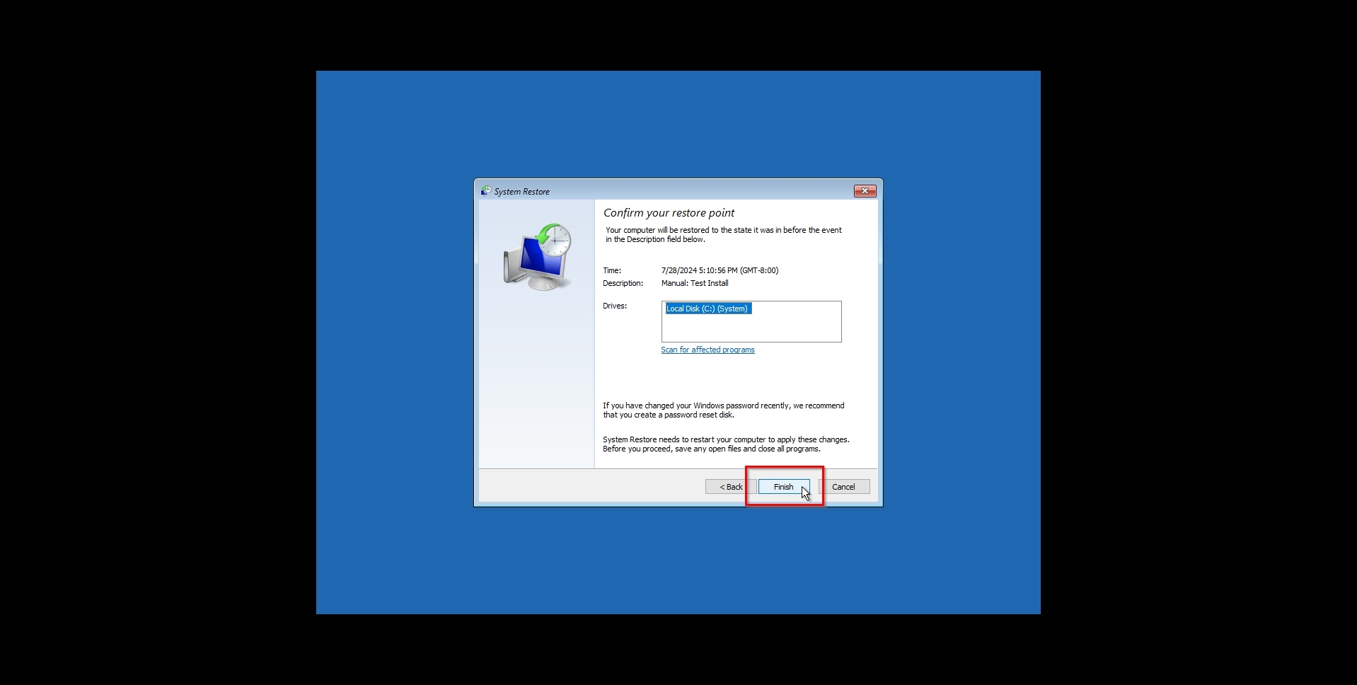 - 準備好後,單擊下一個, , 進而結束將您的電腦恢復到選定的檢查點。