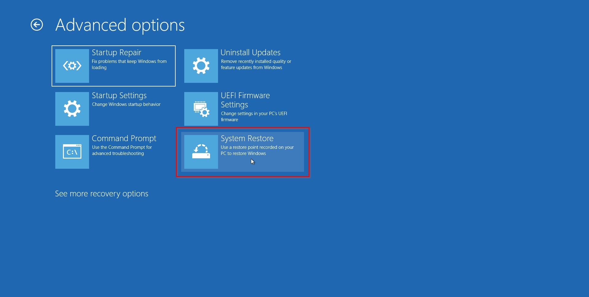 您必須訪問 Windows 預安裝/恢復環境 (Windows PE/RE) 以獲取此解決方案以及以下大多數解決方案。如果您的 Windows 安裝是半可啟動的,則三次失敗的重新啟動應該會將您帶到那裡。如果沒有,您可以從 Windows 安裝介質(例如 DVD 或 USB 閃存驅動器)啟動並選擇修理你的電腦而不是繼續安裝。