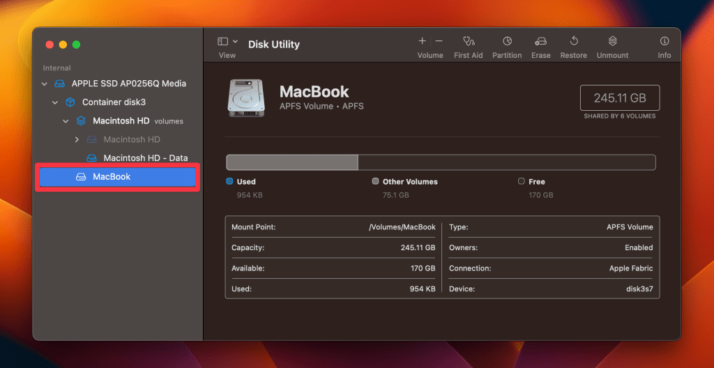 - 從磁盤實用程序窗口左側的列表中選擇您懷疑的磁盤有許可問題。