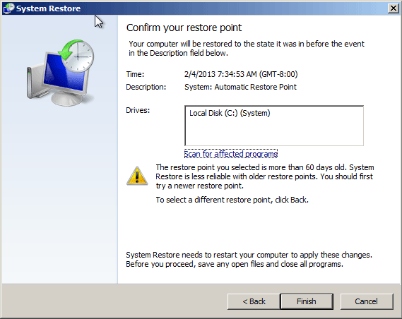 Windows 7 或 Vista 系統還原將確保您不會丟失任何文檔或文件。但是,自相應還原點以來已安裝的任何程序或更新都必須重新安裝。此方法非常適合 Windows 8、7 和 Vista。但它不適用於 Windows XP。