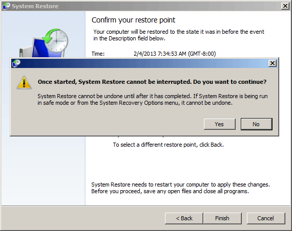 對於出現的警告消息,單擊“是”,確保您要將計算機還原到選定的還原點。恢復過程將開始。可能需要一段時間才能完成,因此請耐心等待。