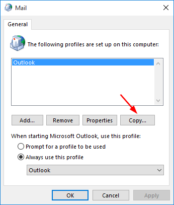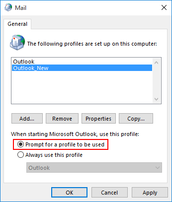 - 在選項“啟動 Microsoft Office Outlook 時,使用此配置文件“,選擇第一個選項(或從下拉列表中選擇新的配置文件,並使 Outlook 自動打開該配置文件)。單擊申請進而好的。