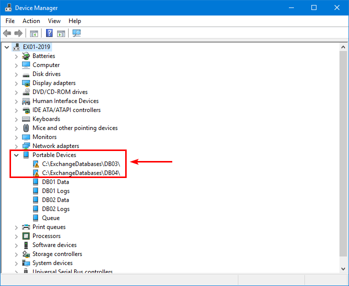開始裝置經理在您的 Windows Server 上並展開便攜式設備部分。您將看到配置的磁盤和安裝點。
