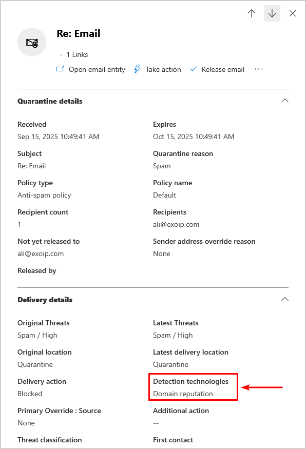 單擊該消息,將顯示詳細信息。表明該消息因檢測技術而被攔截域名聲譽。