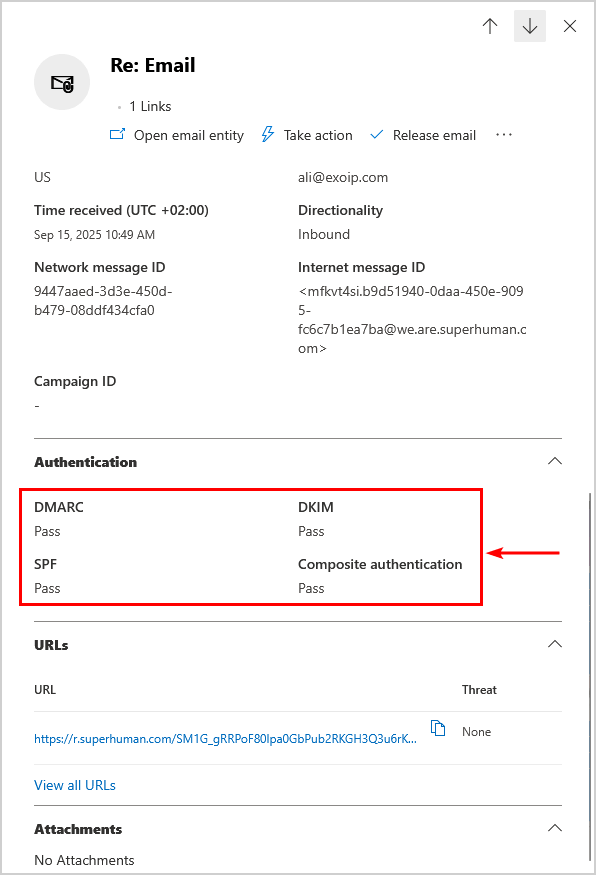 更詳細地查看詳細信息清楚地表明,發件人域的所有配置均正確,並且 Microsoft 不應阻止該郵件。