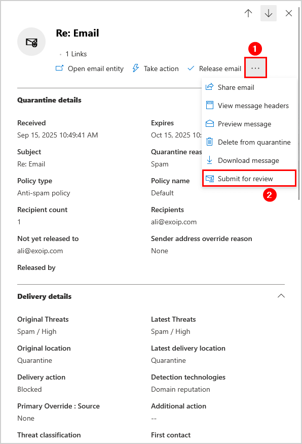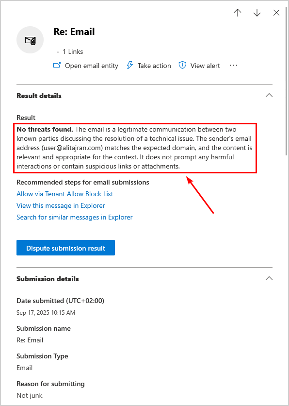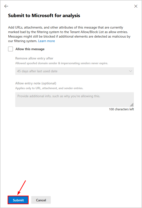 將消息提交給 Microsoft 進行審核,以便他們對其進行分析並提供結果。但是,此過程不會自動從阻止列表中刪除該域。因此,您必須向 Microsoft 團隊提出支持請求,以手動從阻止列表中刪除該域。