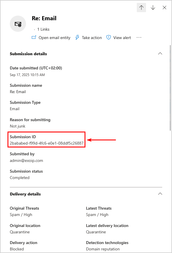 - 在中打開支持請求Microsoft 365 管理中心並添加複制的提交ID到它。確保指導工程師將此支持請求轉發給 Microsoft Defender 團隊,以便他們了解出了什麼問題。