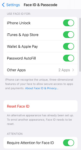 去設定>面ID和密碼查看您的面部ID設置。檢查是否配置了面部ID,並且您要使用face ID的功能處於活動狀態。確保您已經設置在面部ID上以使其正常工作。