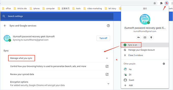 單擊瀏覽器右上角的個人資料菜單圖標,然後單擊“打開同步“。 點擊管理您同步的內容選項。