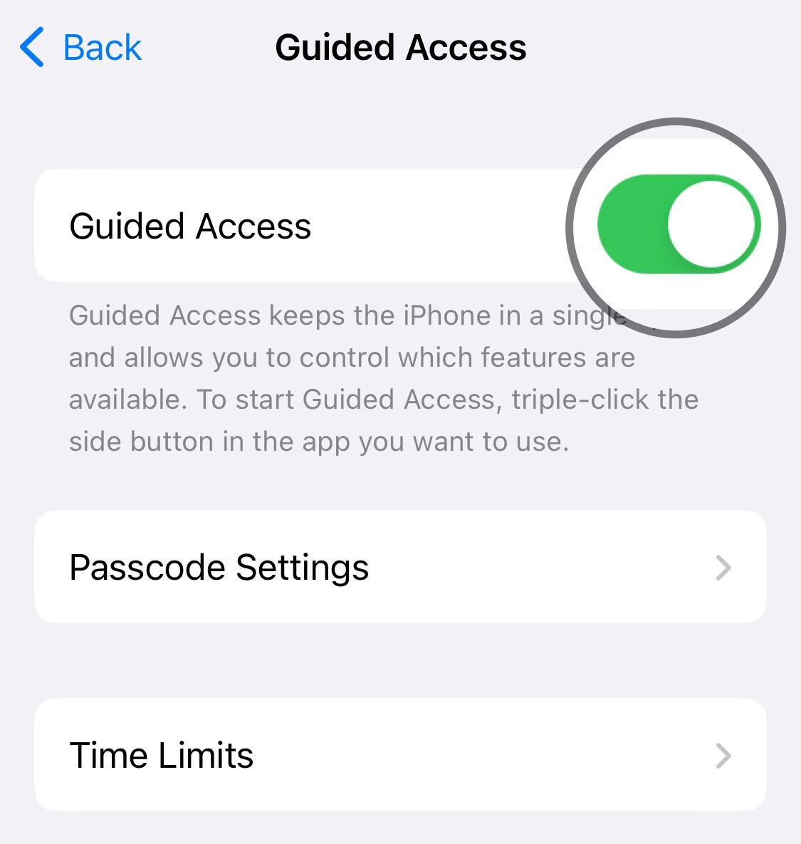 首先,您應該檢查引導訪問的設置是否正確。前往設定>無障礙>引導訪問>切換並轉動它在。