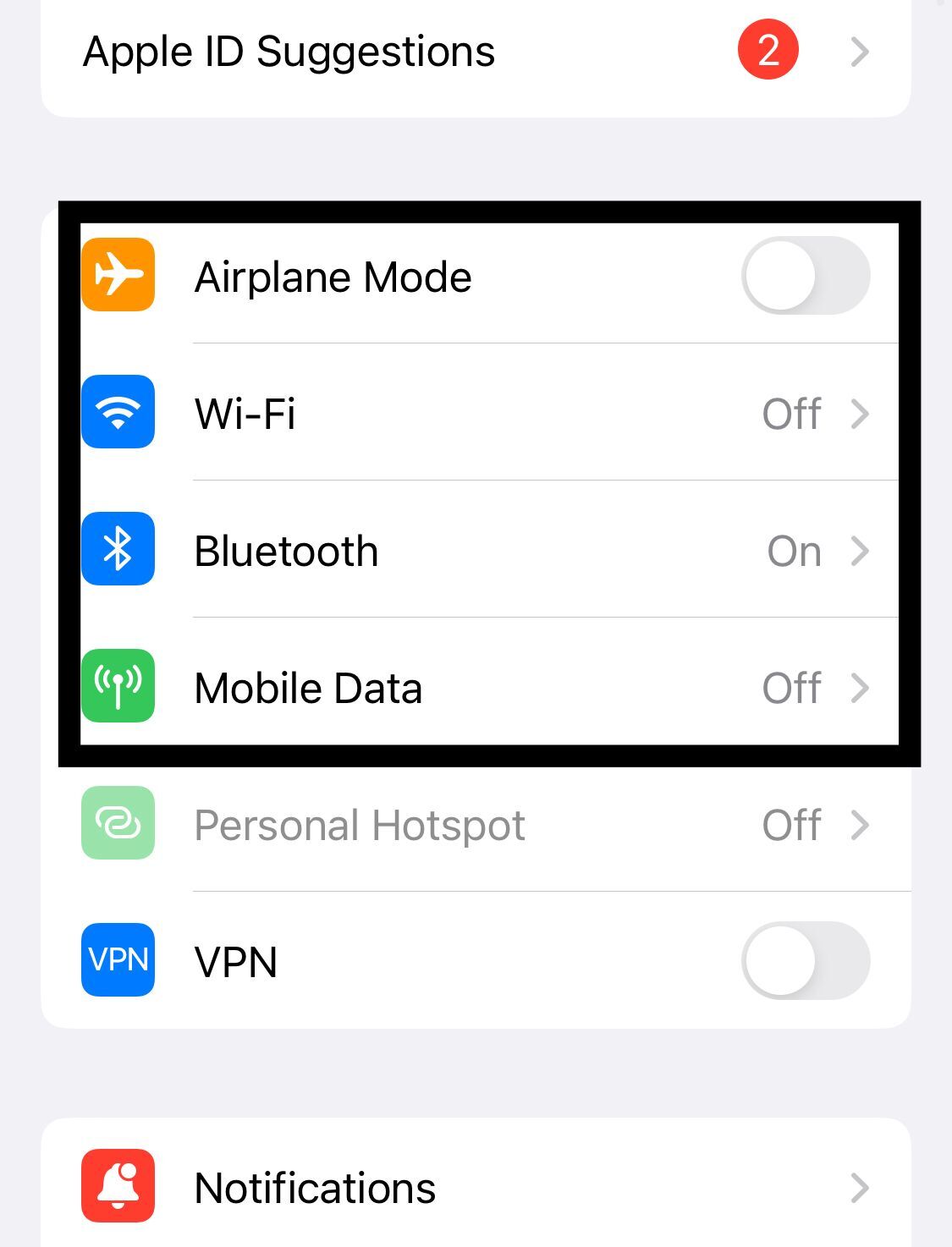 由於無線網絡(包括 WiFi、蜂窩數據和藍牙)中的小錯誤,呼叫轉移設置有時可能會變得無法使用。導航至“設置”並停用藍牙、WiFi、飛行模式和移動數據。一分鐘後,重新打開它們。