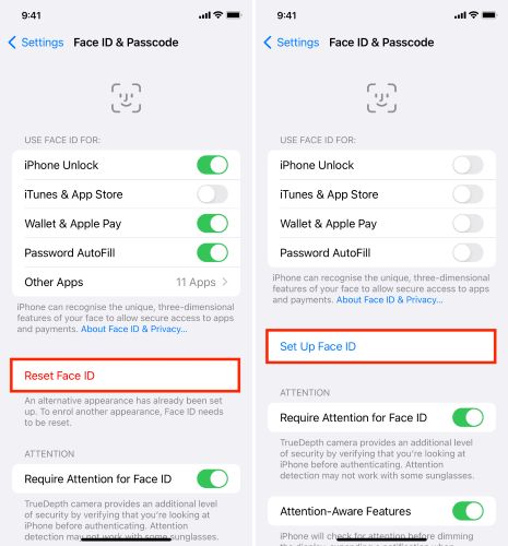 步驟2。在菜單中,點擊重置臉部ID並選擇設置臉部ID從頭開始掃描臉。