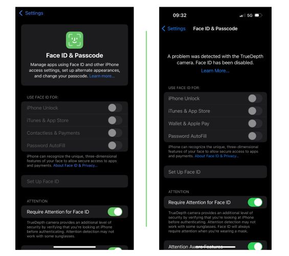 許多用戶還發現,臉部ID和密碼菜單可見,但完全亮了。沒有選擇打開面部ID,也無法調整任何設置。這可能發生: