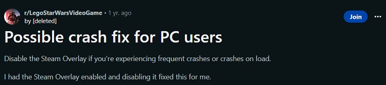 來源:一位 Reddit 用戶通過禁用 Steam Overlay 修復了遊戲啟動時崩潰的問題
