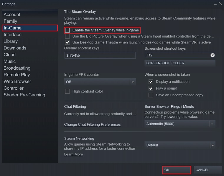 - 從左側菜單中選擇“遊戲內”選項卡,然後取消選中“在遊戲中啟用 Steam 界面”選項。