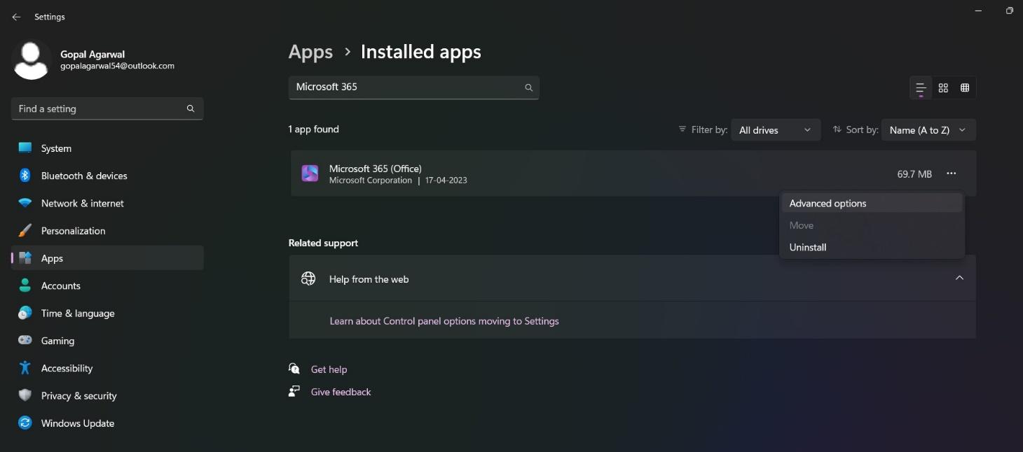 - 搜尋微軟365從應用程序列表中。單擊應用程序名稱上的三個省略號。點擊高級選項從菜單中。