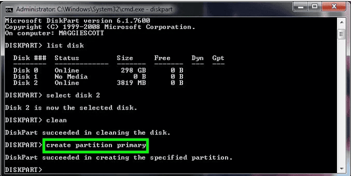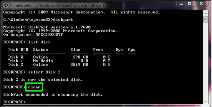 步驟 6:輸入“clean”運行該實用程序並刪除 SD 卡上存儲的所有數據。