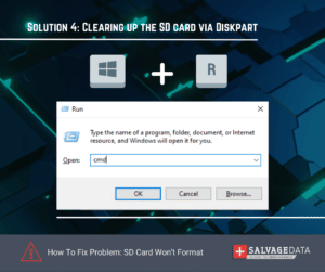 Diskpart是Windows中另一個內置的磁盤分區實用程序,可以幫助您通過清理存儲快速解決SD卡無法格式化的問題。步驟如下:第 1 步:按 Windows + R 組合鍵啟動運行窗口。步驟 2:在“運行”框中輸入 cmd,然後按 Enter 鍵啟動命令提示符 (cmd.exe)。