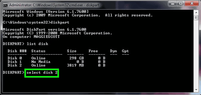 第 5 步:接下來,輸入選擇磁盤#,其中 # 是具有寫保護分區的磁盤(在本例中為磁盤 2)。
