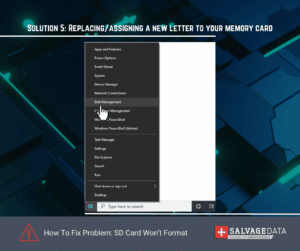 存儲卡盤符與其他驅動器盤符衝突或完全丟失可能是導致 SD 卡無法格式化問題以及系統無法識別存儲的罪魁禍首。要修復此類錯誤,請嘗試為您的媒體存儲分配一個新字母,或通過以下方式替換現有字母:第 1 步:右鍵單擊“開始”按鈕。選擇磁盤管理菜單列表中的選項。
