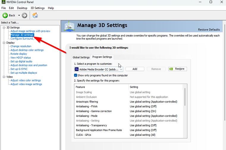 - 在 Nvidia 控制面板界面中,選擇3D 設置進而管理 3D 設置。