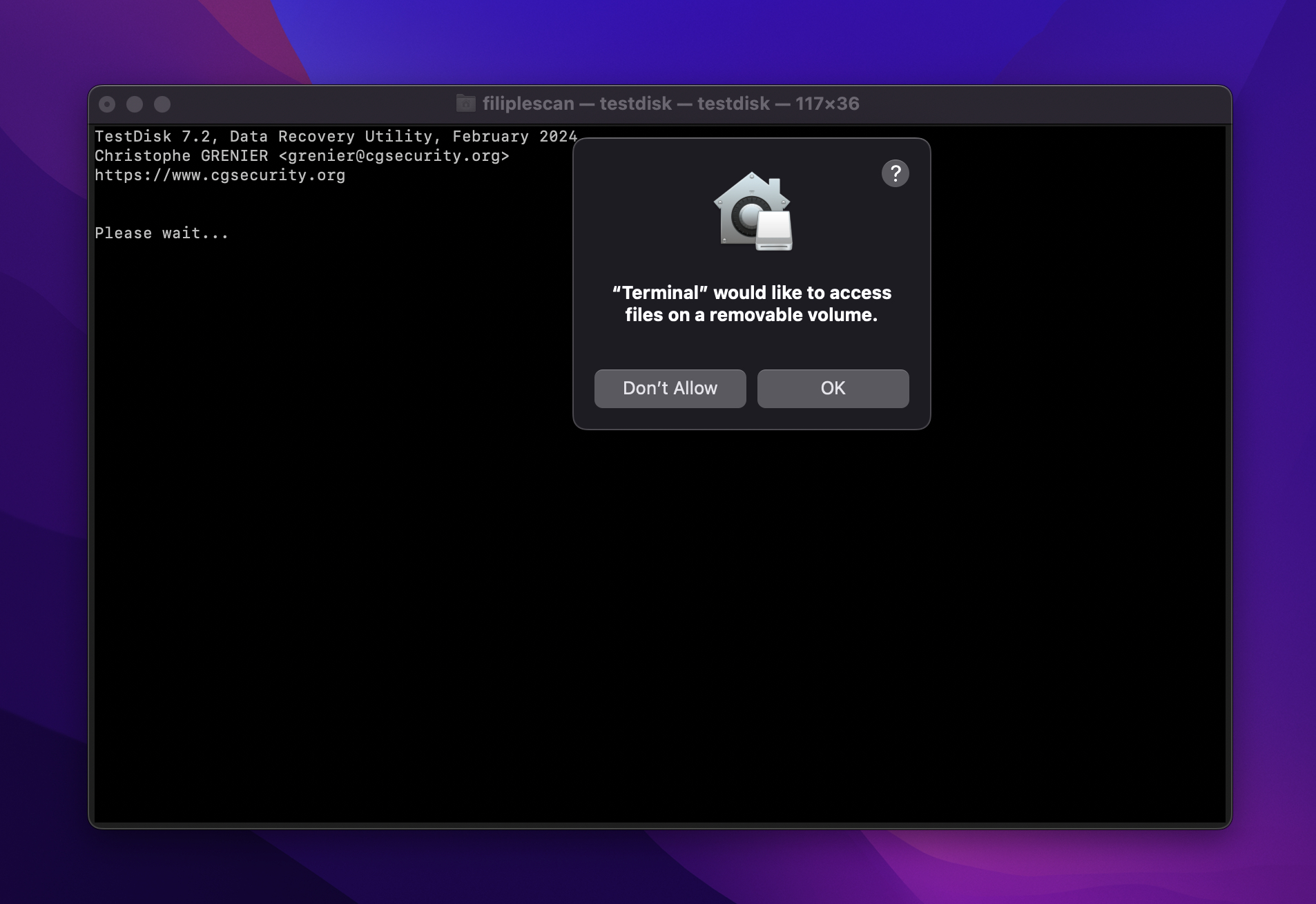 - 將出現一條提示,詢問您是否希望終端訪問可移動卷上的文件。選擇好的。