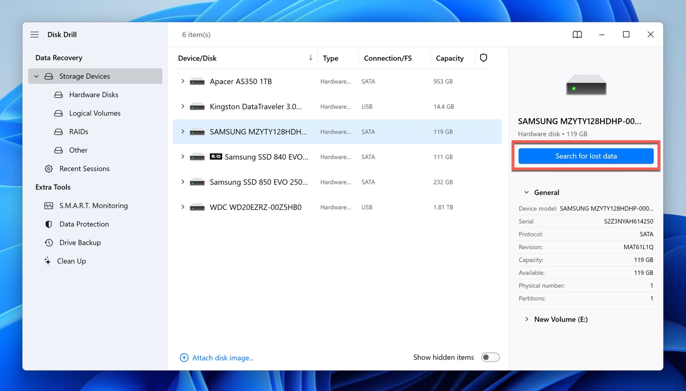 - 啟動 Disk Drill 並在連接的驅動器列表中找到您的 SSD。