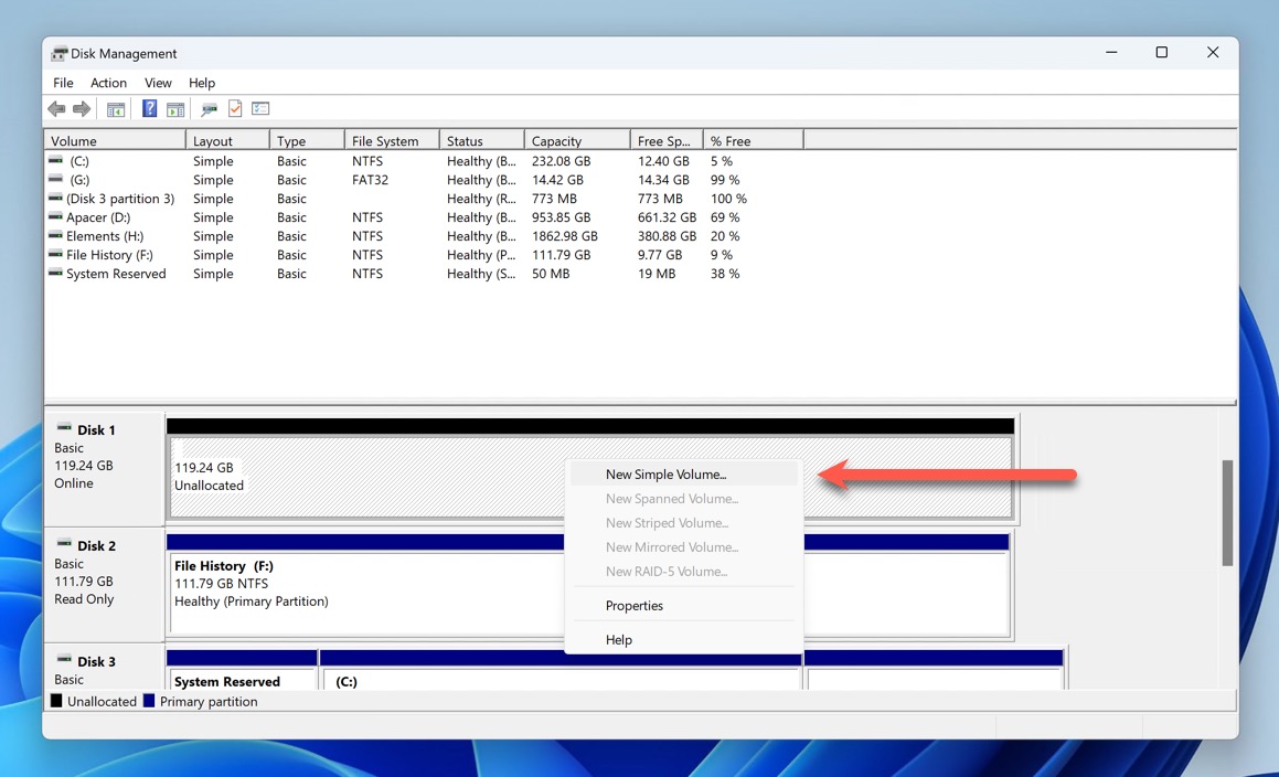- (對於新初始化的 SSD)右鍵單擊代表 SSD 的未分配空間,然後選擇新建簡單卷。將出現一個嚮導,指導您創建新的簡單卷。