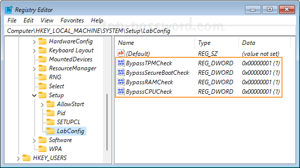 - 重複相同的過程來創建其他 DWORD 值:繞過安全啟動檢查,繞過RAM檢查和繞過CPU檢查,並將它們的值數據設置為 1。