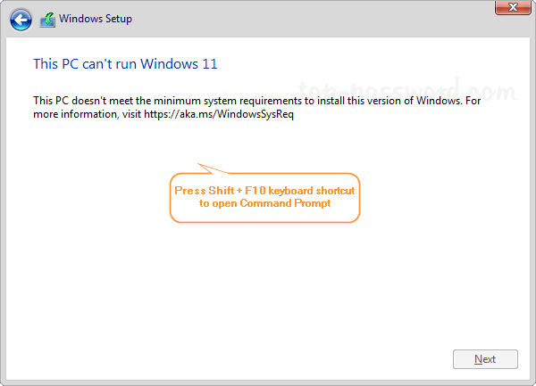 - 當您在安裝過程中遇到錯誤“此電腦無法運行 Windows 11”時,請按轉移+F11打開命令提示符窗口的鍵盤快捷鍵。