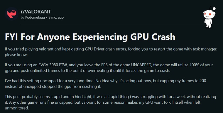 在 Valorant 中限制 FPS 可以防止“圖形驅動程序崩潰”根據消息來源的錯誤。儘管運行像 Nvidia RTX 3080 這樣的高端 GPU,它可以運行估價在 600+ FPS 上,用戶被迫將 FPS 限制為 200。根據沒有限制的用戶的說法,GPU 以最大功率運行以實現盡可能高的 FPS。由於 GPU 以最大功率運行,因此過熱並導致“圖形驅動程序崩潰”錯誤。他們還提到,這種特定的崩潰只發生在《Valorant》中。
