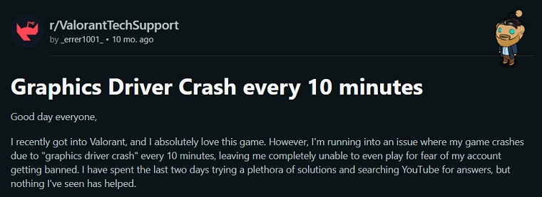 估價不是 GPU 密集型遊戲。然而消息人士稱,他們面臨著“圖形驅動程序崩潰”遊戲幾分鐘後出現錯誤。這可能很煩人,因為估價可能會因放棄多場比賽而禁止您的帳戶。